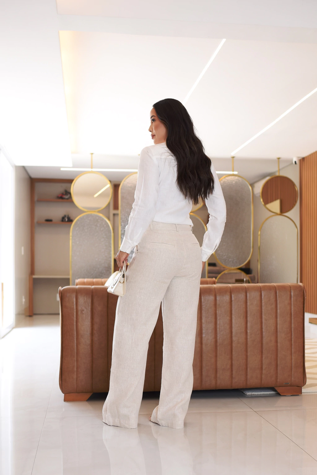 Calça confeccionada em tecido linho puro, possui zíper, botões e bolsos.