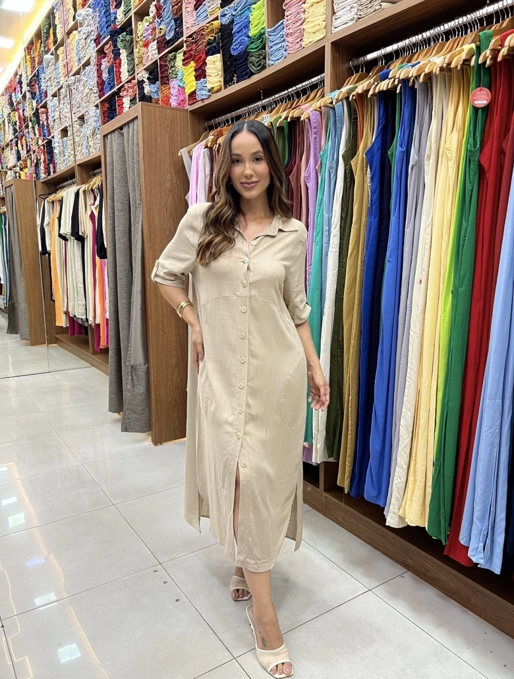 Chemise confeccionada em cambraia de linho, possui botões frontais e bolsos funcionais.
