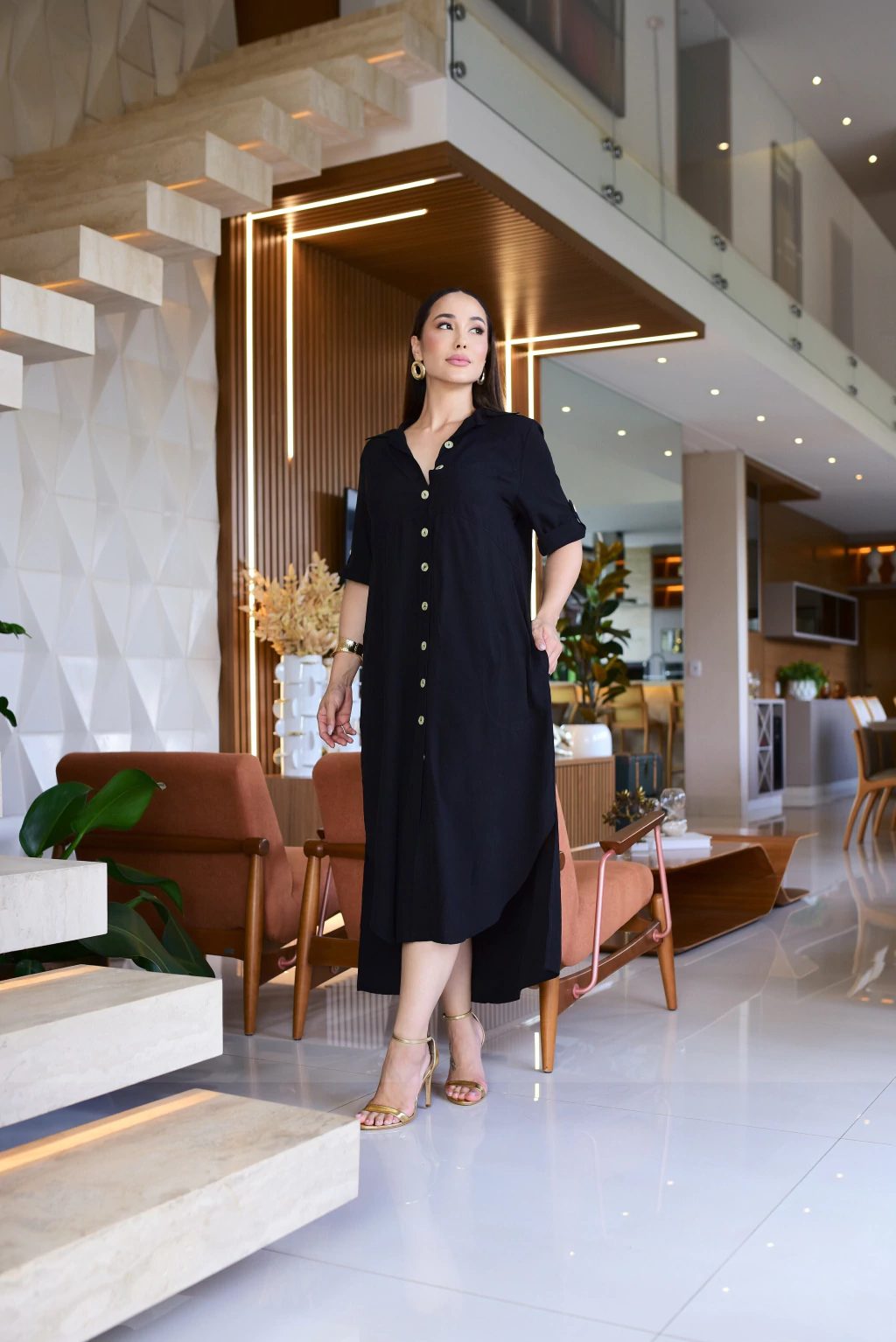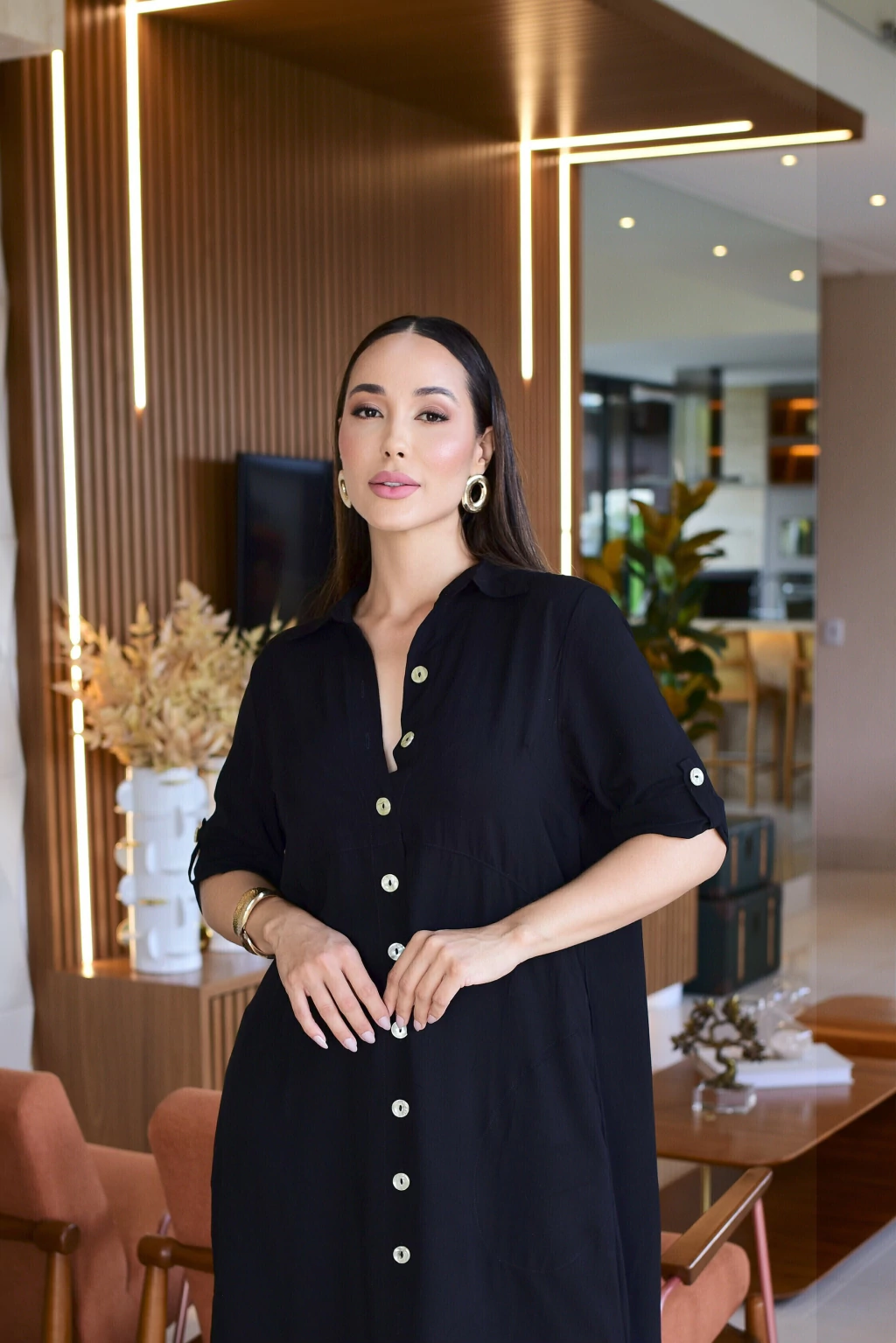 Chemise confeccionada em viscolinho, possui botões frontais e bolsos funcionais.