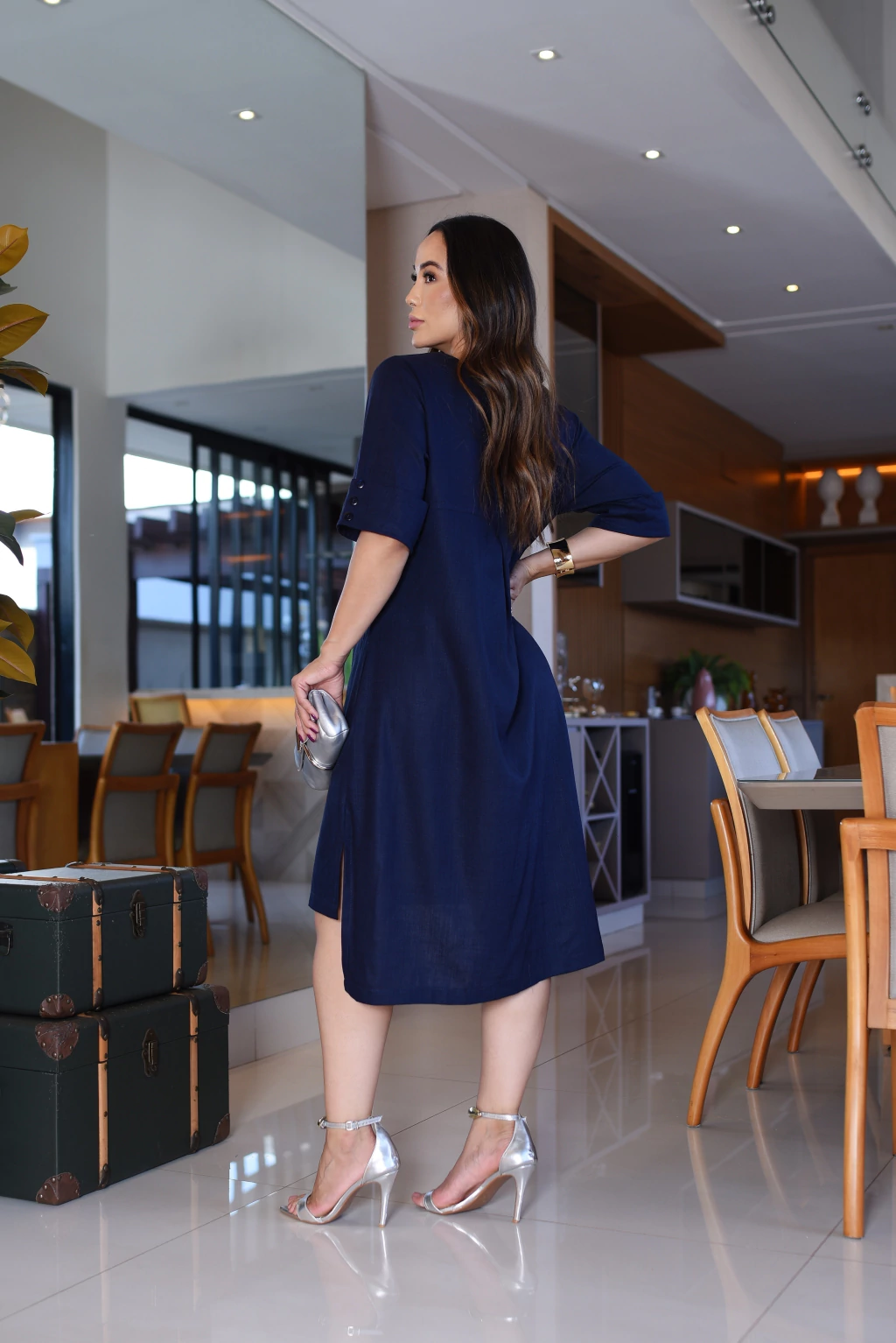 Vestido com modelagem mullet, confeccionado em tecido cambraia de linho, possui botões e bolsos.